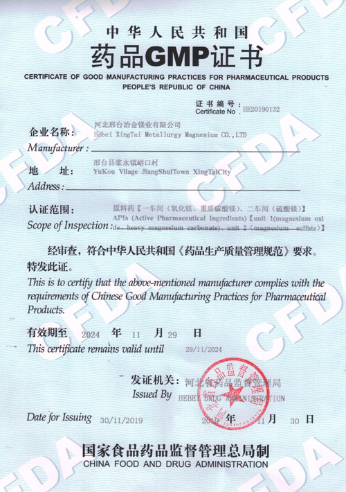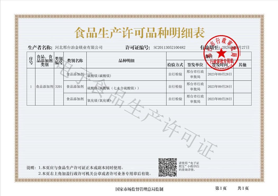 冶金鎂業食品生產許可證正本