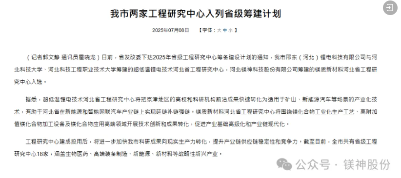 喜報(bào)!鎂神科技鎂質(zhì)新材料河北省工程研究中心入列省級籌建計(jì)劃