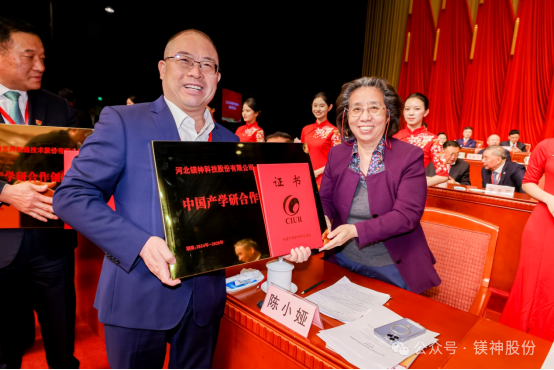 原科技部副部長、中國產學研合作促進會秘書長陳小婭向河北鎂神公司董事長孫文頒發榮譽證書和獎牌