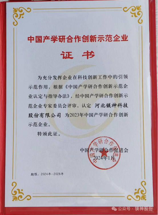 榮譽是進步的階梯。河北鎂神決心以“中國產學研合作創新示范企業獎”為新的征途起點,認真貫徹黨的二十大精神和“全國兩會精神”,全面貫徹新發展理念,加快構建新發展格局,著力推動高質量發展,強化企業科技創新,不斷深化產學研用,打造高技能工程技術人才隊伍,弘揚工匠精神,加快建立以創新價值、能力和貢獻為導向的人才評價體系,強化標準引領和質量支撐,不斷推動產業高端化、智能化、綠色化,積極打造具有影響力的“鎂神科技”品牌,為中國民族產業快速發展傾情貢獻力量。