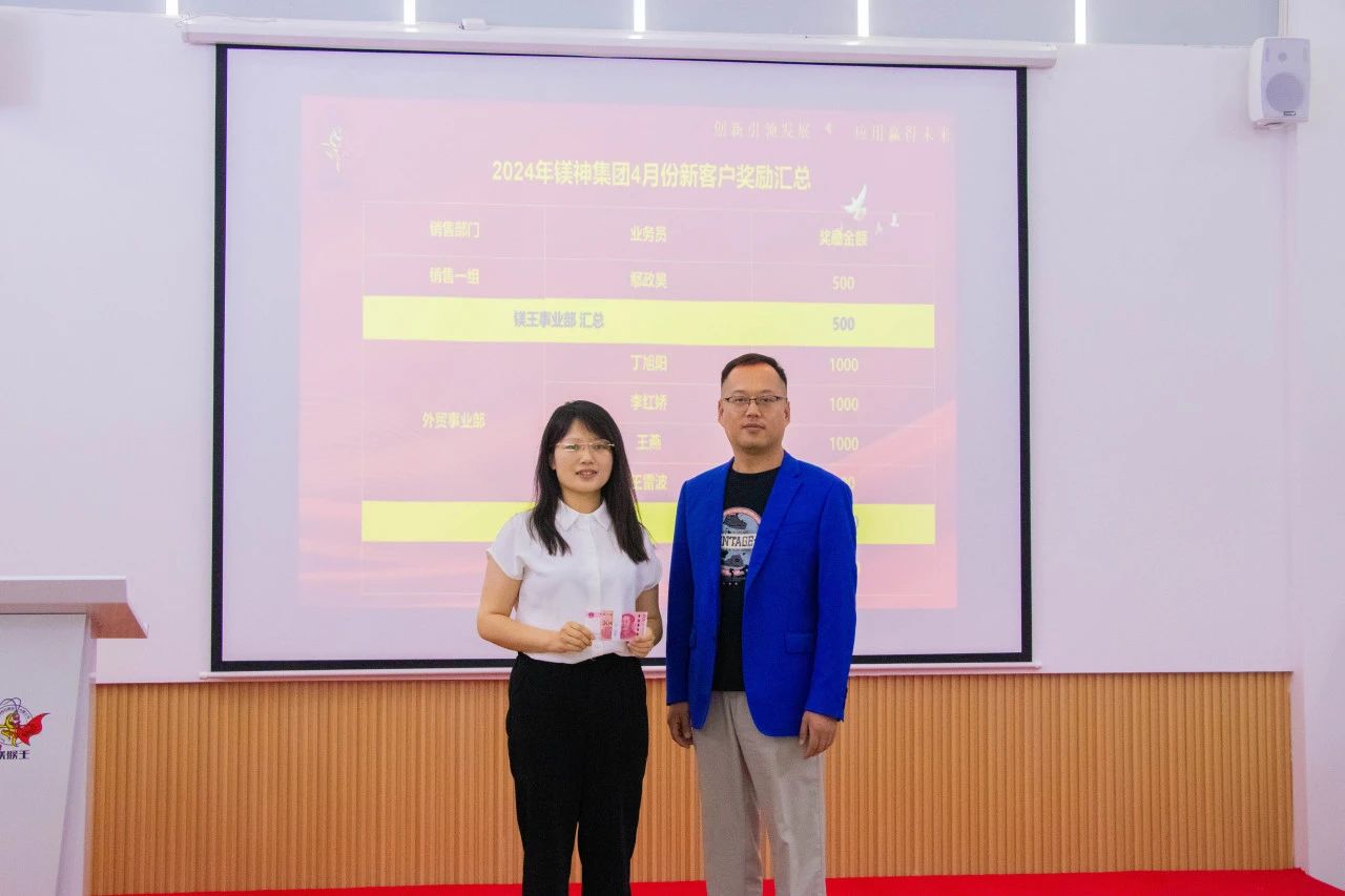 近日,河北鎂神科技股份有限公司迎來了新的業務突破,公司頒發4月份新客戶獎勵,以表彰和獎勵那些為公司帶來新增長點的銷售團隊和個人。